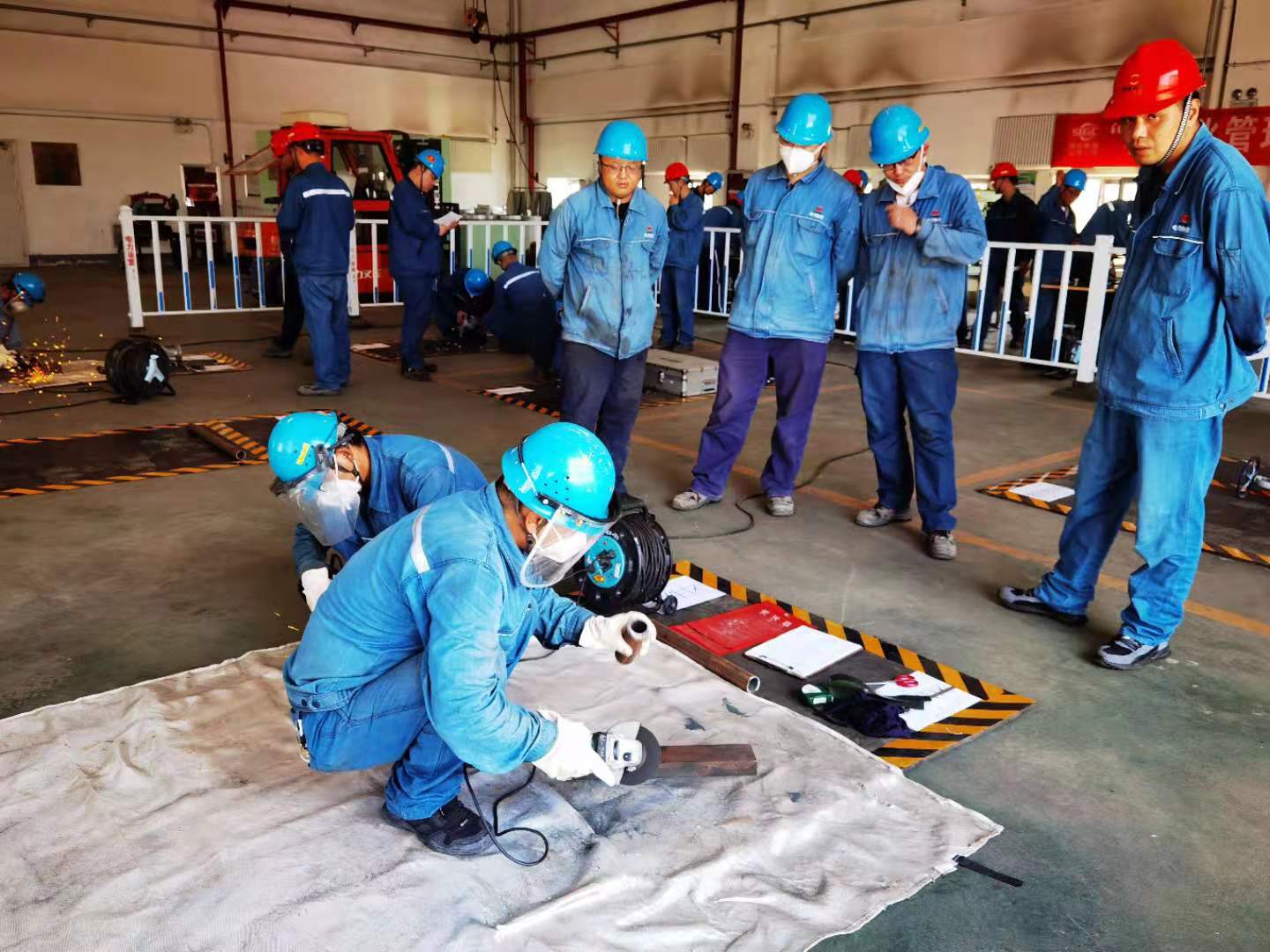 裁判員一聲“開始”,各小組迅速進入預定的比賽區(qū)域,兩人一組,配合默契。機務組參賽選手爭分奪秒地采用角磨機按預給尺寸進行坡口制作、管口打磨。轉(zhuǎn)子找中心過程中,隊員們沉穩(wěn)從容,熟練地架表、測量、記錄,無論是實驗操作還是綜合計算,每個人都精益求精,奮勇爭先。儀電組參賽選手也不甘示弱,有條不絮地進行著電氣盤柜布線、電烙鐵焊接及電動機布線,每一步都態(tài)度認真、操作規(guī)范。經(jīng)過激烈角逐,機務組氣化水班、儀電組電氣1班分別榮獲技能競賽第一名。