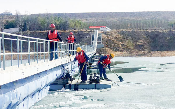 受氣溫回升影響,趙石畔煤電水源地王圪堵水庫冰面融化加速,大塊浮冰撞擊輸水管線浮箱,對取水泵船和輸水管線造成威脅。趙石畔項目部第一時間抽調(diào)人員組織清理疏通冰凌,經(jīng)過9小時不懈努力,上游約2500平米的冰塊全部破碎,徹底疏通輸水管線,有效保證了取水泵船的安全。